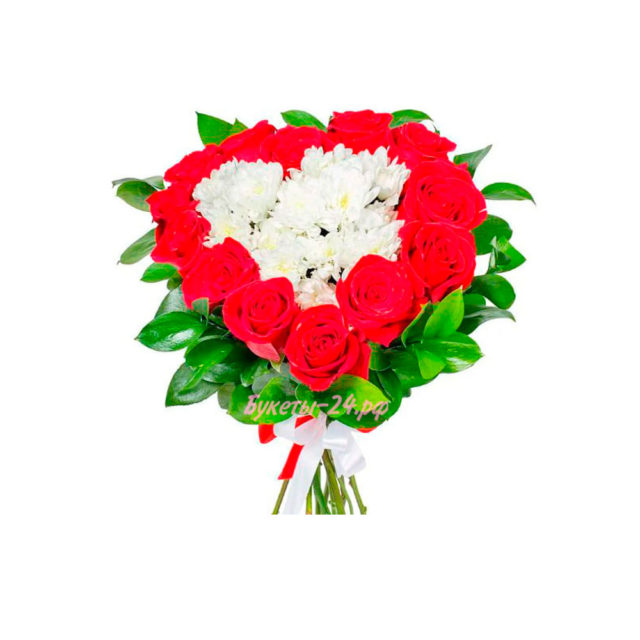 Букет “Сердце” из красных роз и белых хризантемстанет особенным подарком для мамы или бабушки в День матери.